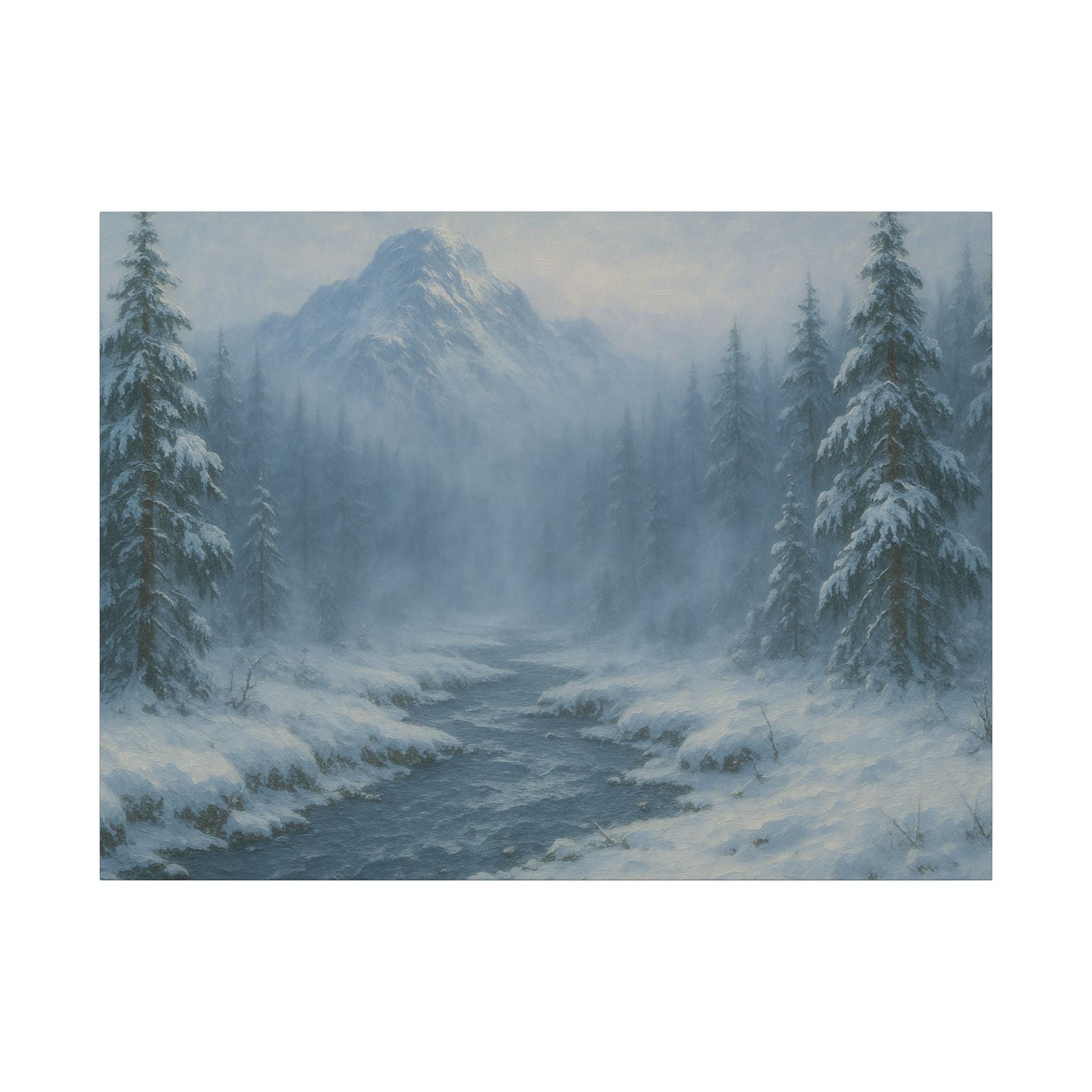 Winter Veil snowy winter landscape canvas wall art captures the calm beauty of towering pines dusted with snow, a gentle stream winding through the landscape, and soft mist rising over distant, snow-covered mountains. This serene winter scene invites reflection, stillness, and a peaceful escape from the everyday.